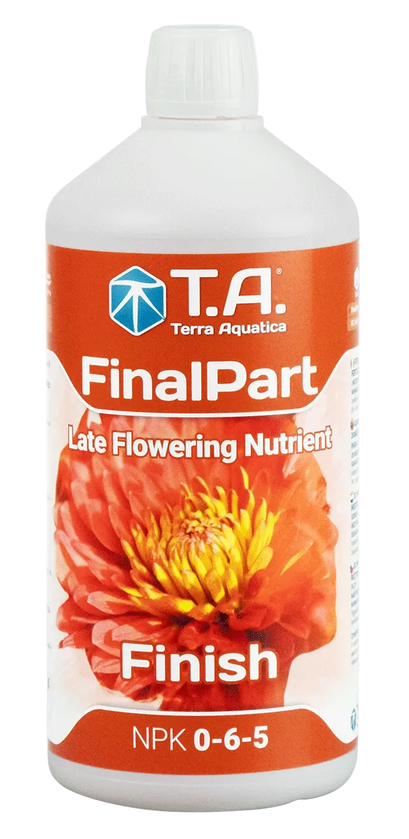 Terra Aquatica FinalPart — чрезвычайно эффективный стимулятор финального цветения. Повышает защитные силы, содержание активного ингредиента, урожайность и качество. Вкус улучшается, а процесс созревания проходит в предсказуемых рамках. Он содержит все необходимые питательные вещества в легкоусвояемой форме и легко дозируется. NPK FinalPart составляет 0–6–5.